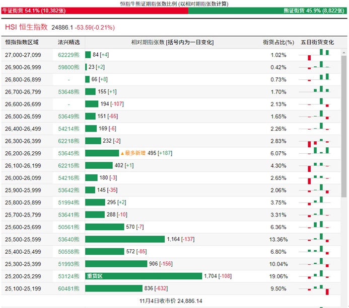 智通财经APP获悉,截至11月4日,恒指最新的牛熊街货比例54:46。法兴恒指牛熊证街货分布图中的数据显示,熊证街货重货区在25200-25299区间,该区间最新熊证数量为1704张,较上一交易日减少108张;最多新增在26200-26299,该区间最新熊证数量为495张,较上一交易日增加187张。牛证街货重货区在23400-23499区间,该区间最新牛证数量为1140张,较上一交易日增加7张;最多新增在24000-24099区间,该区间最新牛证数量为437张,较上一交易日增加218张。