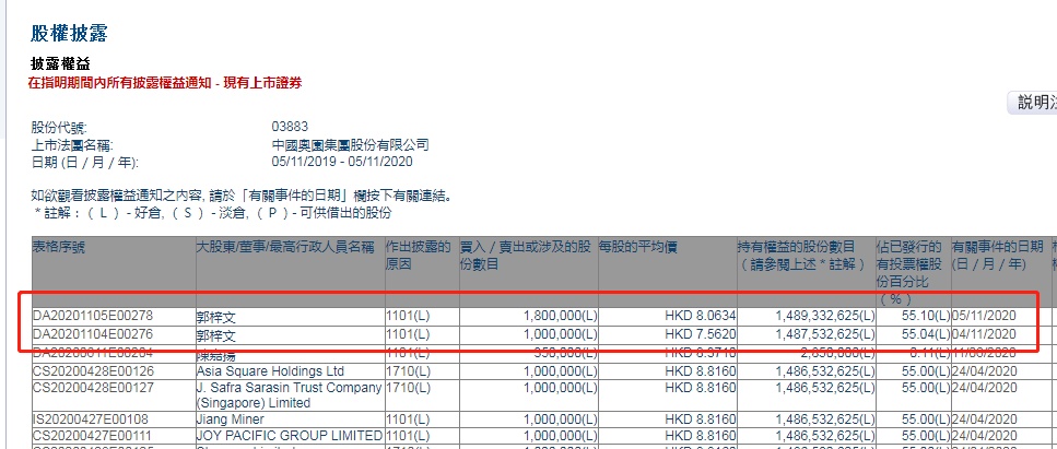 智通财经APP获悉,香港联交所最新资料显示,11月4日、5日,董事会主席郭梓文分别增持中国奥园(03883)100万股和180万股,每股作价7.5620港元和8.0634港元,总金额约为2207.61万港元,增持后最新持股数目约为14.89亿股,最新持股比例为55.10%。