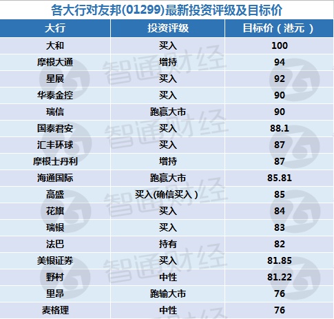 以下为17家券商对友邦保险(01299)最新目标价及评级汇总: