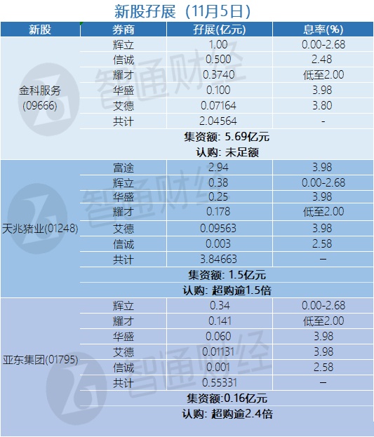 智通财经APP获悉,金科服务(09666)、天兆猪业(01248)、亚东集团(01795)正在招股中,截至11月5日,辉立 、耀才、信诚等券商为金科服务、天兆猪业、亚东集团分别借出2.04564亿港元、3.84663亿港元以及0.55331亿港元,其中金科服务目前尚未足额认购、天兆猪业超购1.5倍、亚东集团超购逾2.4倍。