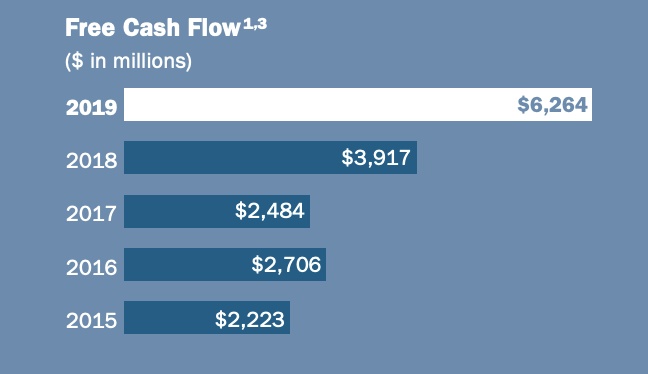 此外,公司有充足的自由现金流。2019年,渤建公司自由现金流为62.64亿美元,比2018年增长了59%。