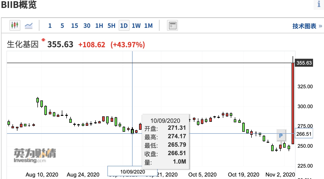 隔夜,渤建公司又称生化基因(BIIB.US)收盘大涨43.97%, 现价报355.63美元(最高报价355.63美元)。
