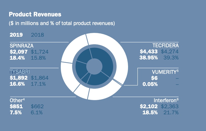 作为世界上治疗多发性硬化症的顶级生物技术公司,2019年,渤健销售了价值63.25亿美元的多发性硬化药,另外还有20.97亿美元的脊髓肌萎缩症药物Spinraza。这些药品构成渤健的大部分收入,约占2019年全年营收的73.95%。
