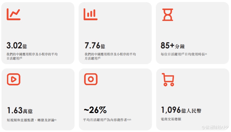 截至2020年6月30日止六个月,用户平均每月向快手应用上传11亿个短视频,并于快手应用上开展了近十亿场直播活动。同期平均日活跃用户2.577亿人,平均月活跃用户4.846亿人。日活跃用户平均每天使用快手应用超出85分钟,访问快手应用超过10次。另外,截至2020年6月30日止六个月的内容创作者占平均月活跃用户在快手应用上的比例约26%。