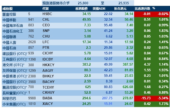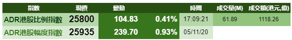 智通财经APP获悉,隔夜美股三大指数继续大涨,而港股ADR指数仅小幅上涨,按比例计算,收报25800点,涨104.83点或0.41%。