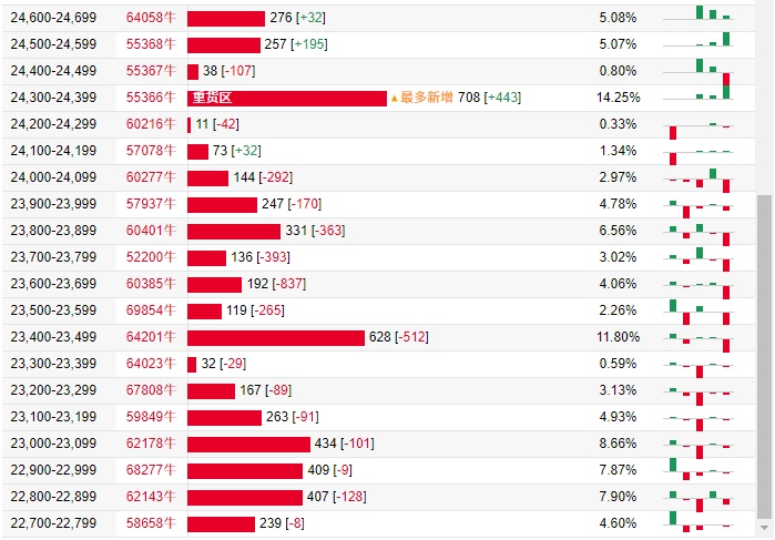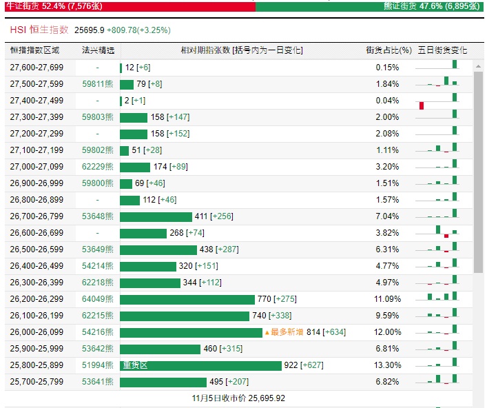智通财经APP获悉,截至11月5日,恒指最新的牛熊街货比例53:47。法兴恒指牛熊证街货分布图中的数据显示,熊证街货重货区在25800-25899区间,该区间最新熊证数量为922张,较上一交易日增加627张;最多新增在26000-26099,该区间最新熊证数量为814张,较上一交易日增加634张。牛证街货重货区在24300-24399区间,该区间最新牛证数量为708张,较上一交易日增加443张,最多新增亦在该区间。