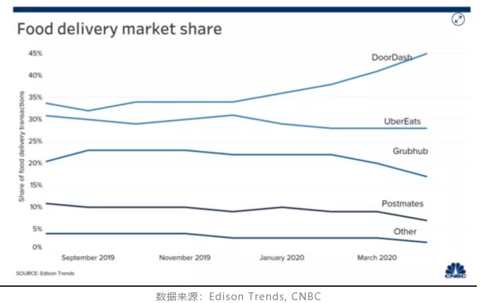 根据研究机构Edison Trends的数据,截止今年3月,DoorDash目前拥有最大的市场份额,约为45%。