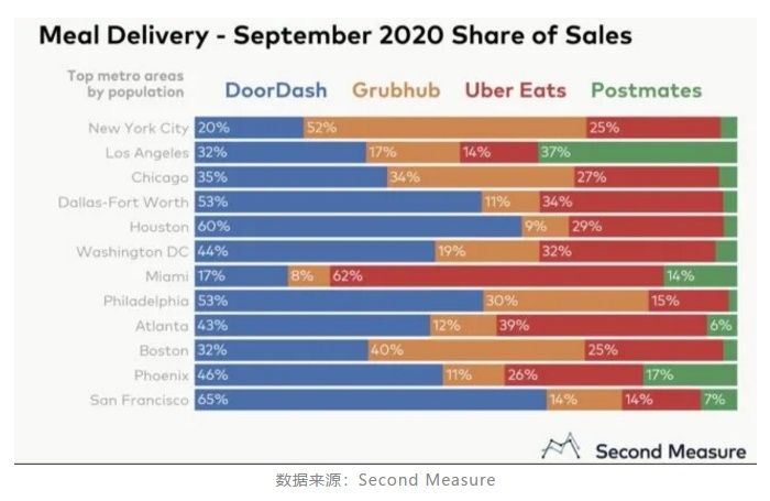 跟随DoorDash其后的,是Uber Eats,约占28%的市场份额。