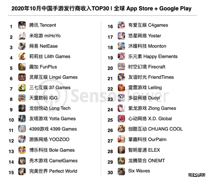 智通财经APP获悉,Sensor Tower商店情报平台显示,2020年10月中国手游发行商在全球 App Store 和 Google Play 的收入排名。榜单中30个手游发行商10月全球吸金21亿美元,环比增长9%,占当期全球手游总收入30.5%。