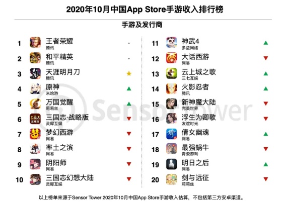 中国App Store手游收入Top20方面,《天涯明月刀》以半个月的收入,跻身收入榜前三。若只对比10月中下旬,其收入已经超越《和平精英》。