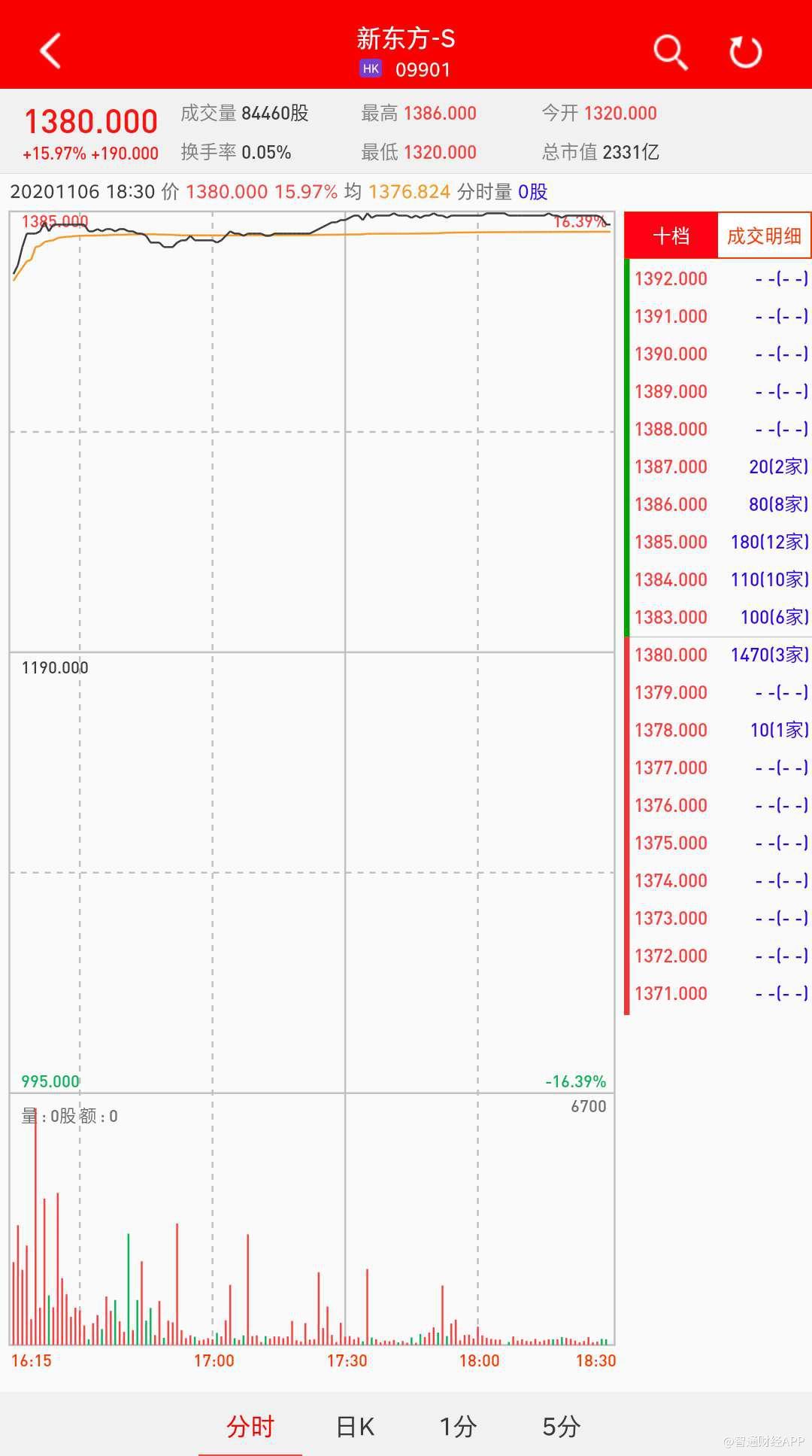 智通财经APP获悉,新东方-S(09901)将于11月9日在香港挂牌,截至暗盘收盘,利弗莫尔证券资料显示其暗盘报价1380港元,较招股价1190港元涨15.97%。每手10股,不计手续费,每手赚1900港元。