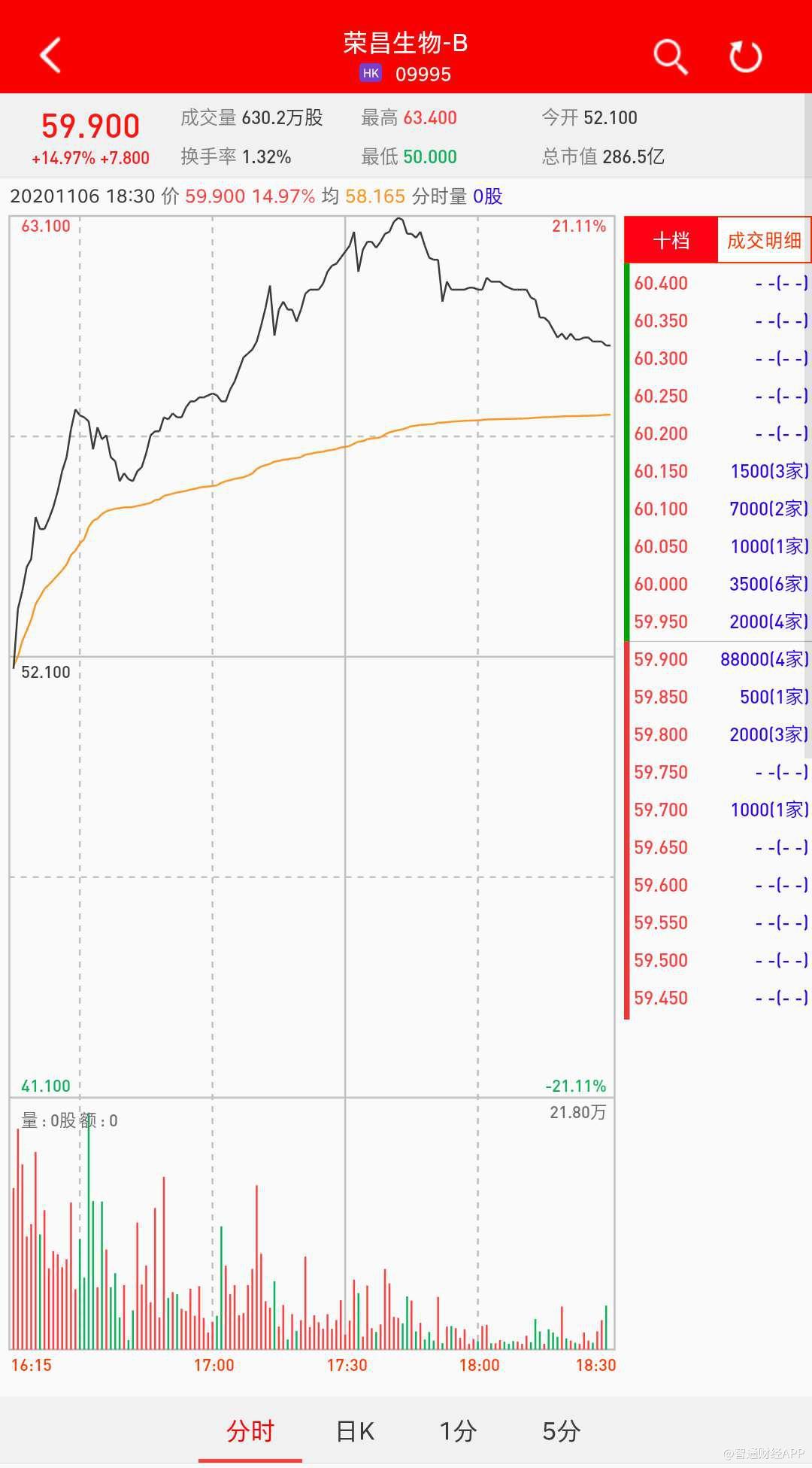 智通财经APP获悉,荣昌生物-B(09995)将于11月9日在香港挂牌,截至暗盘收盘,利弗莫尔证券资料显示其暗盘报价59.90港元,较招股价52.10港元涨14.97%。每手500股,不计手续费,每手赚3900港元。
