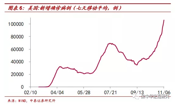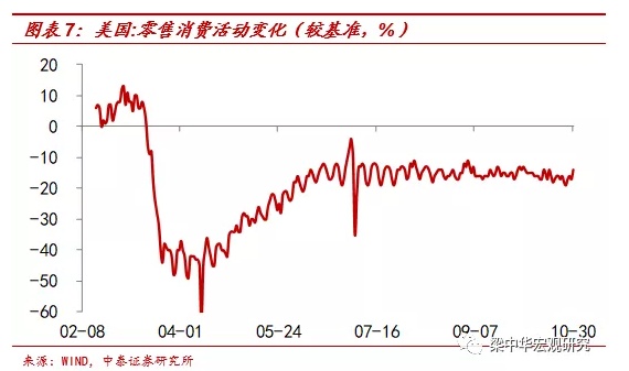 近期美国卫生事件再度失控,近一周平均每日新增病例超过10万人,已经超过第二波卫生事件高峰,尤其是一度单日新增12.5万,创历史纪录,第三波卫生事件已经袭来。加之,美国大选结果短期无法揭晓、财政刺激谈判也陷入僵局,美国经济和就业的复苏将继续放缓。例如,截止10月30日,美国零售消费活动较基期仍下滑16%,必需消费活动也较基期下滑7%,恢复陷入瓶颈。