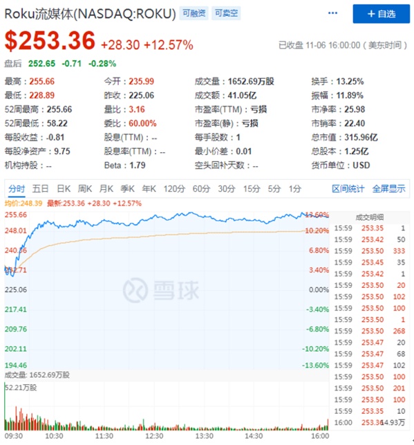 美东时间11月5日美股盘后,流媒体公司Roku(ROKU.US)发布了2020财年三季度的财务报告。财报数据显示,平台收入和播放器收入的较大涨幅,明显提振本季度Roku营收。财报发布后,Roku盘后股价涨幅超10%。截至目前,Roku盘后股价为252.65美元,市值为315.96亿美元。