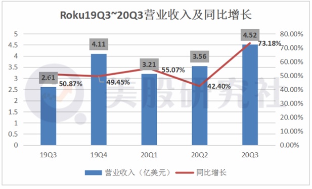 本季度财报数据显示,Roku的季度总营收为4.52亿美元,与去年同期的2.61亿美元相比,同比涨幅达73.18%;上一季度Roku的季度总营收为3.56亿美元,环比上涨26.97%。