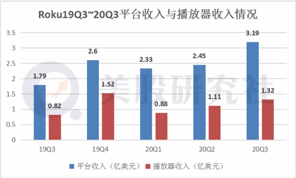 从上图近五个季度Roku的营收数据来看,本季度营收创新高突破70%,而此前四个季度的营收涨幅约为50%。究其营收增长背后的原因,美股研究社认为这或许在于Roku平台收入和播放器收入在本季度的大幅增长息息相关。