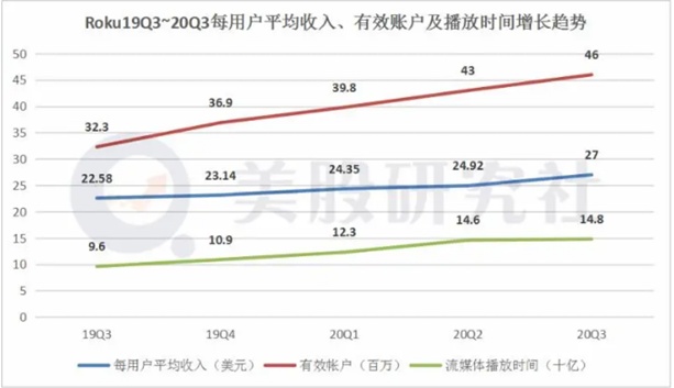 本季度,Roku活跃用户数增加290万人,使活跃用户总数达到4000万人,平台观看时数达148亿小时。在此期间,每用户平均收入年增速20%至27美元。