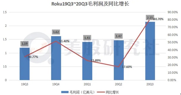 本季度,Roku的财报数据显示,毛利润表现为2.15亿美元,相较于上年同期的1.19亿美元,同比增长80.7%;与上一财季的1.47亿美元相比,环比增幅为46.3%。