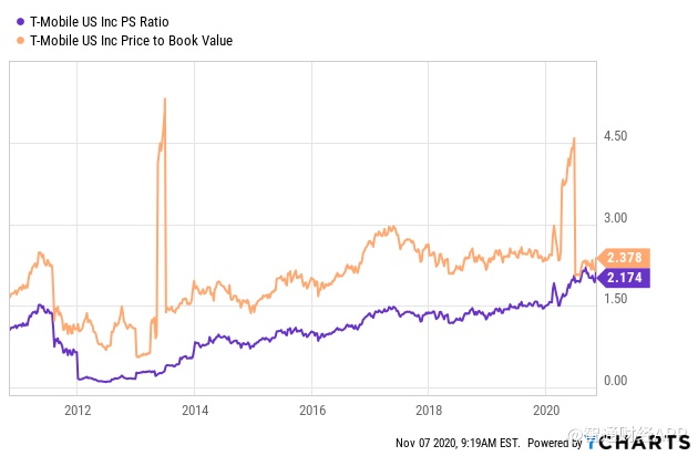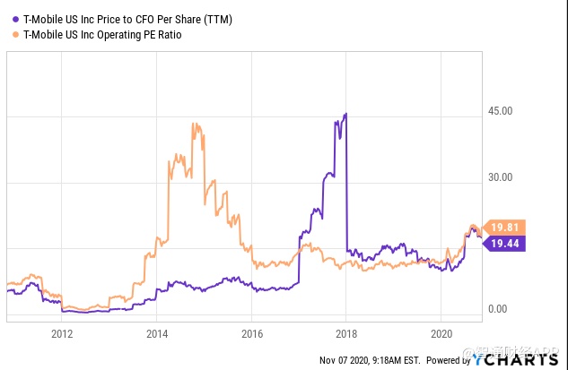 作为一家增长率处于行业领先地位的公司,T-Mobile的估值指标仍处于10年平均水平左右。尽管该公司股价在过去24个月里上涨了一倍,但可以解释其基础运营业务扩张支撑了目前123美元的股价。