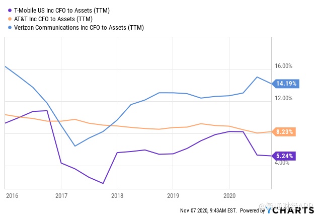 现金流占资产负债表上资产的比例略低于行业平均水平,因为T-Mobile急于建设其无线网络。从下图5年的图表来看,自2016年以来,急剧上升的现金流被更大的净资产增长所抵消。此外,在削减成本提高总现金流和收入业绩之前,与Sprint的合并将需要数年时间来完全整合。关闭多余的零售商店,减少重叠的企业管理职位的人员,这些都刚刚开始。