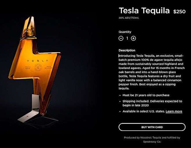 11月6日,特斯拉在其官方网站推出了同品牌龙舌兰酒(Tesla Tequila)。该款酒被特斯拉描述为“独家、小批量生产的高档酒,百分之百采用龙舌兰草酿造”,其装在一个闪电形状的玻璃酒瓶中。一瓶酒的容量为750毫升,酒精度40%,售价250美元,约合人民币1658元,比一瓶飞天茅台酒(官方指导价1499元)还要高。