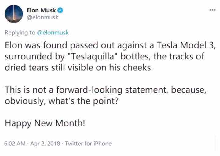 2018年4月,特斯拉龙舌兰Tesla Tequila相加的英语单词特斯兰“Teslaquilla”首次出现在马斯克的推特中。彼时,马斯克发文称,“特斯拉由于耗尽了所有的资金,将宣布破产,而马斯克则用一瓶‘特斯兰’浸透了他的悲伤。”这是马斯克对于为了制造Model 3而倾尽所有的自嘲。