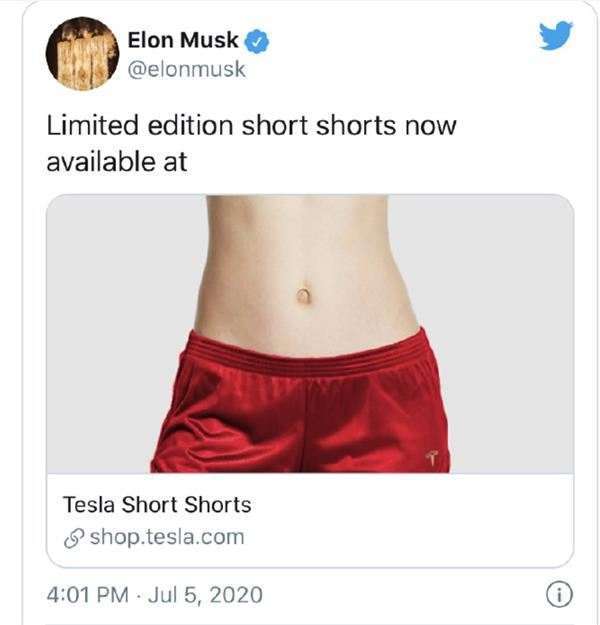 推出沽空短裤或为嘲讽“做空者”。此前,马斯克曾发推文称,特斯拉将制作亮红色缎面并配有金边装饰的“沽空短裤”,并寄几条给“沽空者致富委员会”以安慰他们度过这段艰难时期。