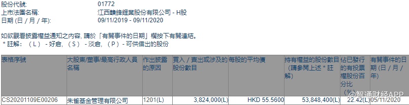 智通财经APP获悉,香港联交所最新资料显示,11月5日,朱雀基金管理有限公司减持赣锋锂业(01772)382.4万股,每股作价55.56港元,总金额约为2.21亿港元。减持后最新持股数目约为5384.84万股,最新持股比例为22.42%。