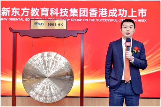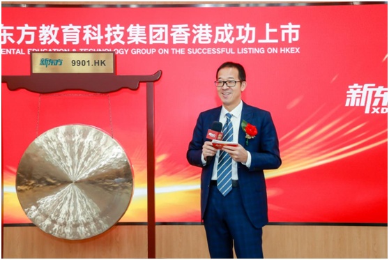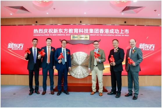 受公共卫生事件影响,新东方当天在北京集团总部举行了云上市仪式,新东方教育科技集团董事长俞敏洪、首席执行官周成刚、首席财务官杨志辉、副总裁张戈、副总裁孙东旭与独立董事杨壮,通过与香港联交所远程连线共同完成“云敲锣”,宣告新东方教育科技集团同时登陆中国香港和美国两个国际化的资本市场。新东方开盘价1381港元,较发行价上涨16%,市值达2335亿港元。
