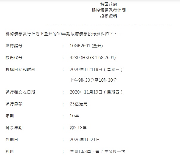 智通财经APP获悉,香港金融管理局以香港特别行政区政府代表身份于今日(星期一)公布,重开在机构债券发行计划下推出的10年期政府债券(债券)(发行编号10GB2601),作5年期债券供投标。该批重开债券将于2020年11月18日(星期三)进行投标,并于2020年11月19日(星期四)交收。