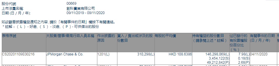 智通财经APP获悉,香港联交所最新资料显示,11月4日,摩根大通减持创科实业(00669)31.0298万股,每股作价108.6386港元,总金额约为3371.03万港元。减持后最新持股数目约为1.46亿股,最新持股比例为7.98%。