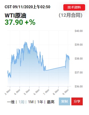 拜登赢得大选,国际油价在刚刚过去的周末经历了震荡式上涨,WTI一度涨逾3%,至38.38美元/桶,布伦特原油也重新站上40美元。