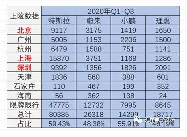 特斯拉截至2020年Q3,9个月的时间上牌了8万台车,主要的销售区域主要是限购城市,上牌量为4.777万台,占整个比例的59.43%,从分布来看,第一大销售区域是上海1.587万台,Model 3快成街车了;然后是深圳(9392台)和北京(9117台)。