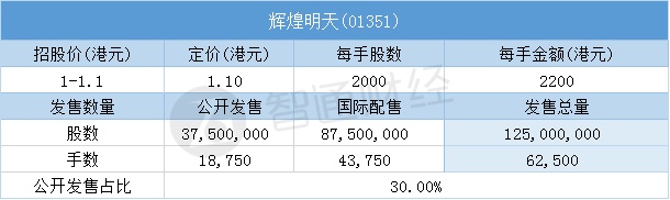智通财经APP获悉,11月10日,辉煌明天(01351)配售结束。配售招股价1-1.1港元,最终定价1.1港元,每手2200港元。