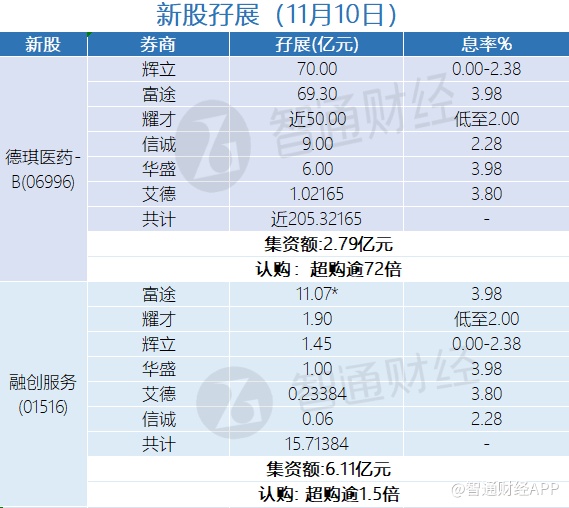 智通财经APP获悉,德琪医药-B(06996)、融创服务(01516)正在招股中。截至11月10日,辉立 、耀才、信诚等合计分别为其借出近205.32165亿港元、15.71384亿港元。其中,德琪医药-B超购逾72倍,融创服务超购逾1.5倍。