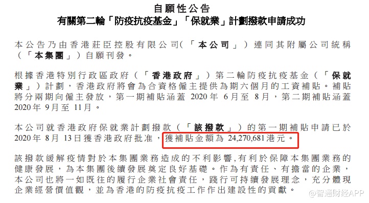 智通财经APP了解到,庄臣控股就香港政府保就业计划拨款的第一期补贴申请已于2020年8月13日获中国香港政府批准,公司获得补贴2427.07万港元。业绩释放叠加大额补贴,庄臣控股的业绩或许能实现大幅增长。