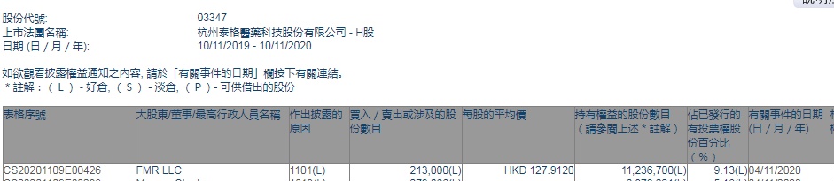 智通财经APP获悉,香港联交所最新资料显示,11月4日,FMR LLC增持泰格医药(03347)21.3万股,每股作价127.912港元,总金额约为2724.53万港元。增持后最新持股数目约为1123.67万股,最新持股比例为9.13%。