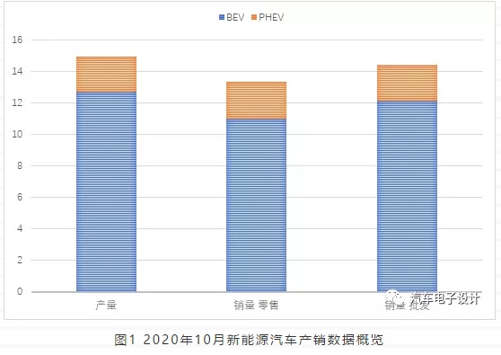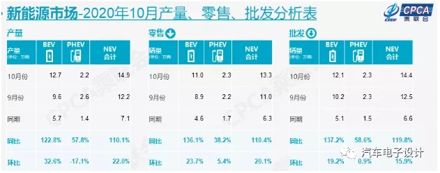 10月份是加库存的概念,所以新能源汽车总体的产量是大于销量的。因为2020年有油耗积分和新能源积分的约束,加上2020年Q1-Q2的量太少,所以Q4需要补一些回来。所以我们看到10月新能源乘用车来到了14.9万台,其中纯电12.7万,PHEV 2.2万;批售基本是跟着产量来走的,零售还没跟上,有1.6万的差额。对比9月的12.66万台(纯电10万台,PHEV 2.63万台)的数据来看,并没有增加特别多。预期后面2个月会突破到15-18万的样子。