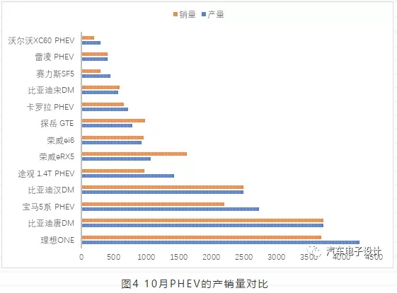 我们可以看到这个月明显的特征是PHEV上不来,本来预期月产量会拉到3万台,实际来看前期产能前两位的是理想ONE和唐DM,宝马5系PHEV和途观PHEV等好几台合资的PHEV的量并没有如前面那样在年底加量。从整体的比例来看,PHEV自主品牌的占比提高了不少。