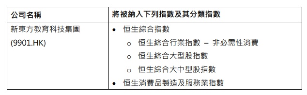 智通财经APP获悉,11月10日,恒生指数公司发布公告称,由于新东方教育科技集团(09901)符合恒生综合指数的快速纳入指数规则要求,将被纳入恒生综合指数(恒生综合行业指数–非必需性消费、恒生综合大型股指数、恒生综合大中型股指数)、恒生消费品制造及服务业指数。将于2020年11月20日(星期五)收市后变动,并于2020年11月23日(星期一)起生效。