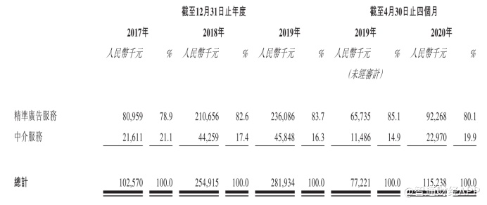 据公司招股书显示,2017-2019年间,公司收入实现65.8%的年复合增长,至2019年度公司收入达到2.82亿元人民币。其中,中介服务(信息流广告)和精准广告服务为公司两大收入来源。