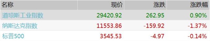 道指上涨262.95点,收于29,420.92点,涨幅0.9%。不过,标普500指数和纳斯达克综合指数在主要科技股大幅下挫的情况下表现艰难。标准普尔500指数下跌0.1%,收于3,545.53点;纳斯达克综合指数下跌1.4%,收于11,553.86点。