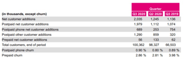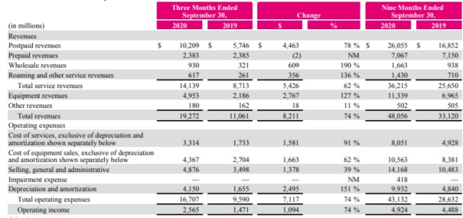 营收增长的很大一部分来自与Sprint的合并,尤其是后付款收入。其后付款服务用户量在2020年第三季度增加了197.9万人,上年同期单季度增加了107.4万人,且高于分析师预期。