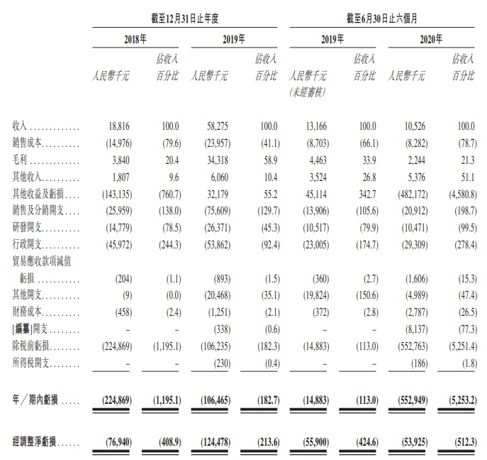 公司的毛利率由2018年的20.4%增加至2019年的58.9%,截至2020年6月30日止六个月的毛利率减少至21.3%。