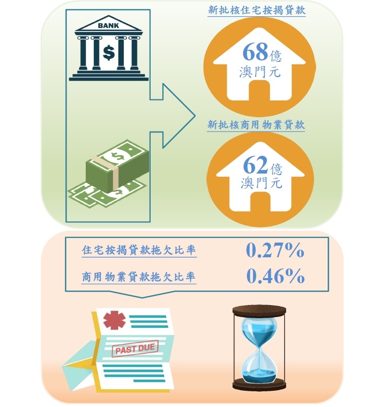 由于期内多笔大额贷款已结清,未偿还商用物业贷款遂环比减少2.3%,与一年前比较亦下跌5.0%,至1,739.8亿澳门元;其中,居民部份占93.3%。与一个月前比较,居民及非居民部份的未偿还商用物业贷款分别下跌2.4%及0.2%。