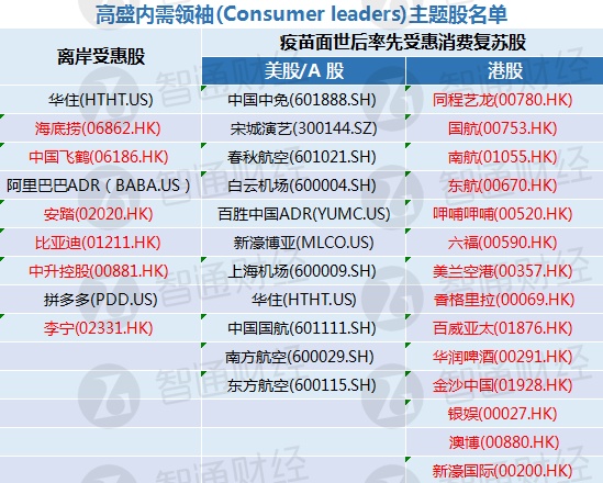 智通财经APP获悉,高盛发表报告,列出了其所挑选内需领袖(Consumer leaders)主题股名单,以及假设新冠疫苗一旦推出后、可率先受惠消费复苏主题股名单。