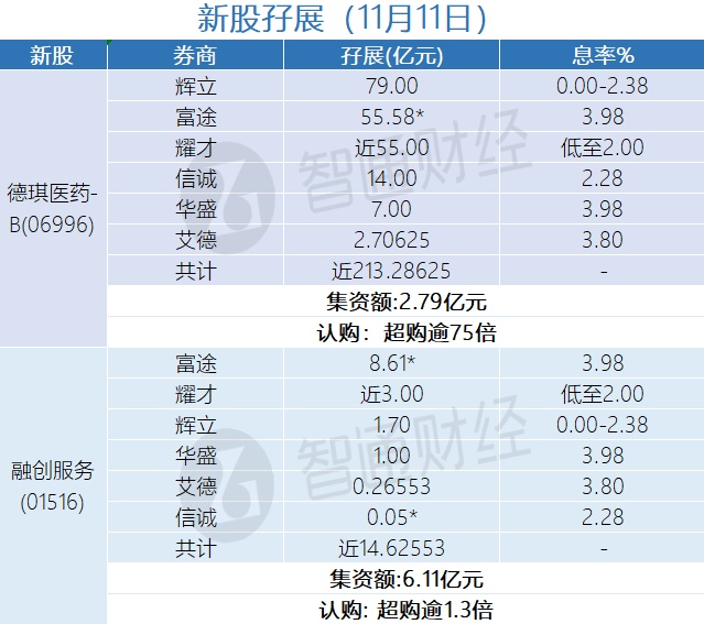 智通财经APP获悉,德琪医药-B(06996)、融创服务(01516)正在招股中。截至11月11日,辉立 、耀才、信诚等合计分别为其借出近213.28625亿港元、近14.62553亿港元。其中,德琪医药-B超购逾75倍,融创服务超购逾1.3倍。