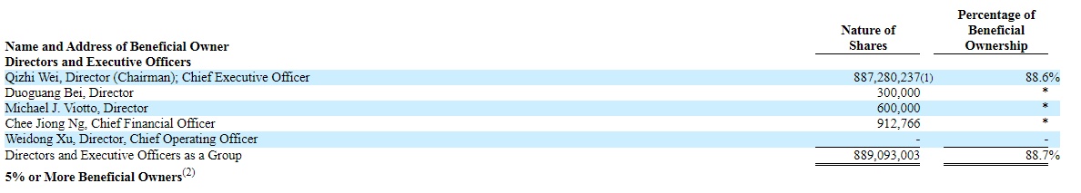 公司董事长兼首席执行官Qizhi Wei持有公司88.6%的股权。