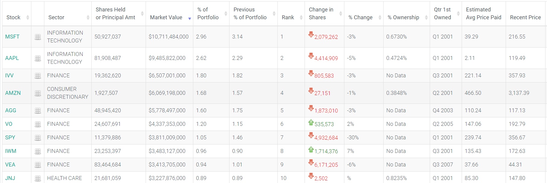 富国银行前十大重仓股中,金融类占6只。前五大重仓股依次是微软(MSFT.US,占投资组合比例为2.96%)、苹果(AAPL.US,占投资组合比例为2.62%)、标普500ETF-iShares(IVV.US,占投资组合比例为1.80%)、亚马逊(AMZN.US,占投资组合比例为1.68%),和美国全债市ETF-iShares(AGG.US,占投资组合比例为1.60%),五只标的均有不同比例的减持。