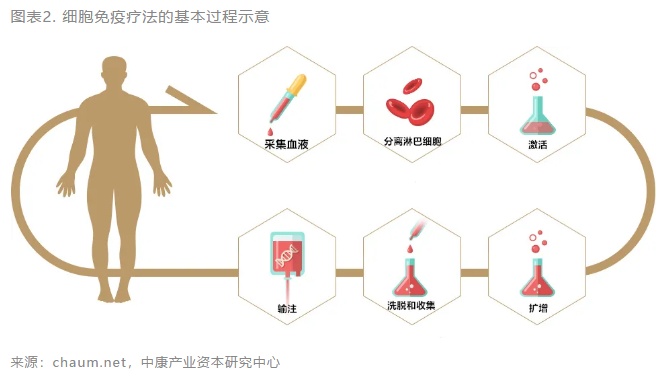 细胞免疫疗法(cell immunotherapy),或者说免疫细胞疗法(immune cell therapy),其基本过程为采集人体免疫细胞,体外激活以增强靶向杀伤能力,扩增后回输人体,通过调动人体免疫系统杀伤血液和组织中的癌细胞、病原体和突变细胞等(图表2)。